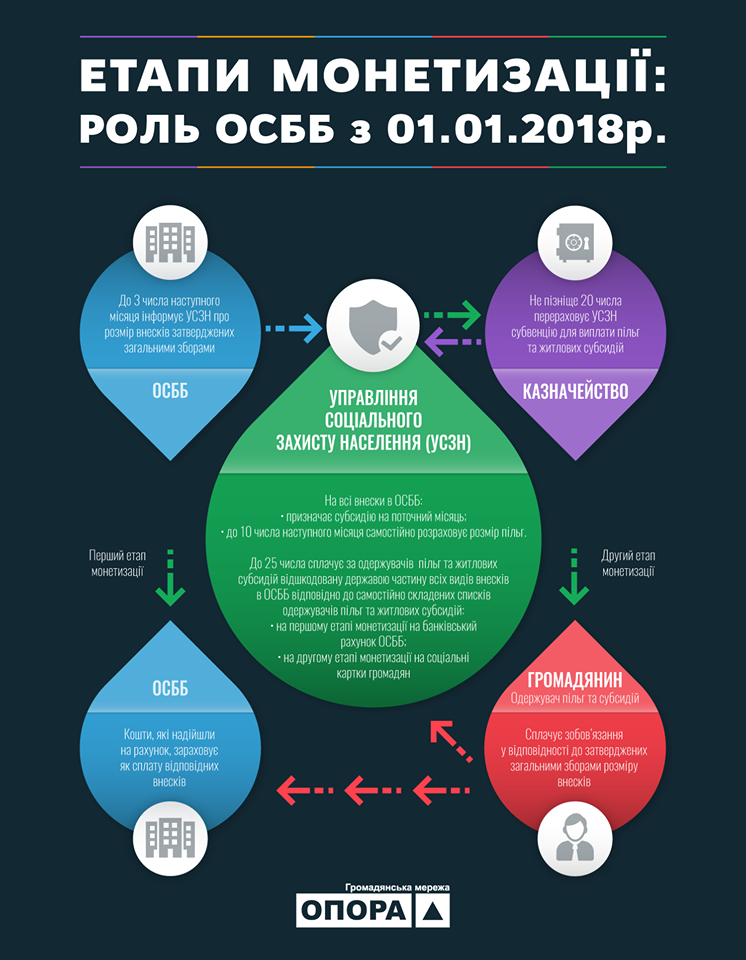 Тому альтернативою могла би бути виплата пільг і субсидій на існуючі пенсійні рахунки/картки, картки для отримання соціальної допомоги, або через відділення “Укрпошти”, з застереженням, що в разі нецільового використання (наявності заборгованості зі сплати внесків) громадянин позбавляється пільги/субсидії. У такому разі ОСББ вважають, що 2-й етап монетизації вже міг би бути запроваджений з 1 травня 2018 року.