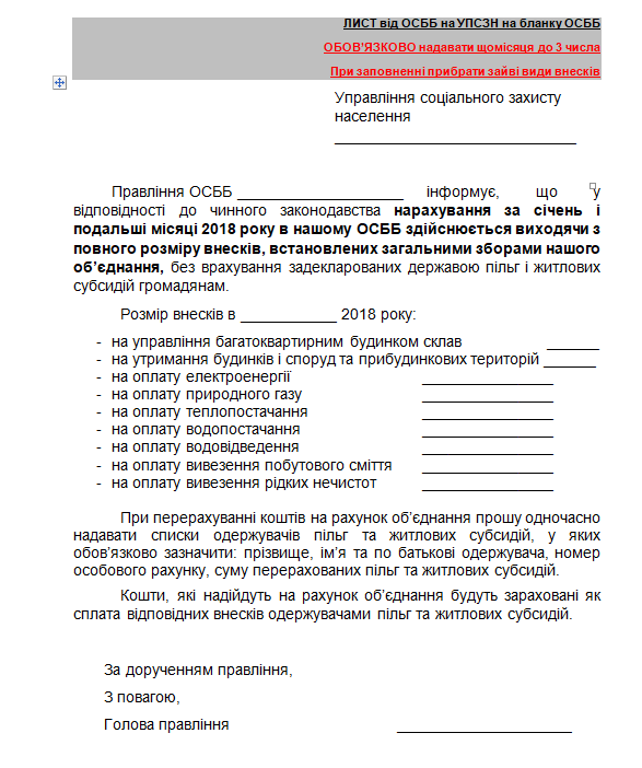 Одночасно з перерахуванням коштів УСЗН надає ОСББ списки, в яких обов’язково зазначаються: прізвище, ім’я та по батькові одержувача, номер особового рахунку, сума перерахованих пільг та житлових субсидій.